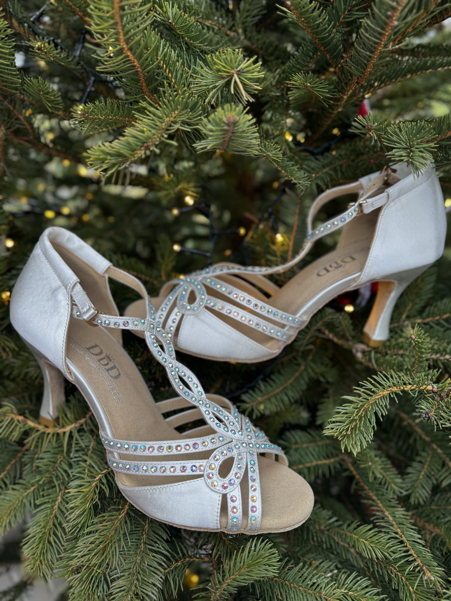 Wykonane z jest z satyny w kolorze białej satyny i ręcznie zdobione kryształkami, szerokie paski zapewniają doskonałe trzymanie stopy i zabezpieczają przed wysuwaniem się stopy do przodu. Całość pokryta jest błyszczącymi kryształkami, które dodają butom wyjątkowego blasku i sprawiają, że wyróżniają się na każdej imprezie tanecznej. Dzięki swojej elegancji, buty te mogą być również doskonałym wyborem na specjalne okazje, takie jak śluby – stanowią idealną alternatywę dla klasycznych butów ślubnych.