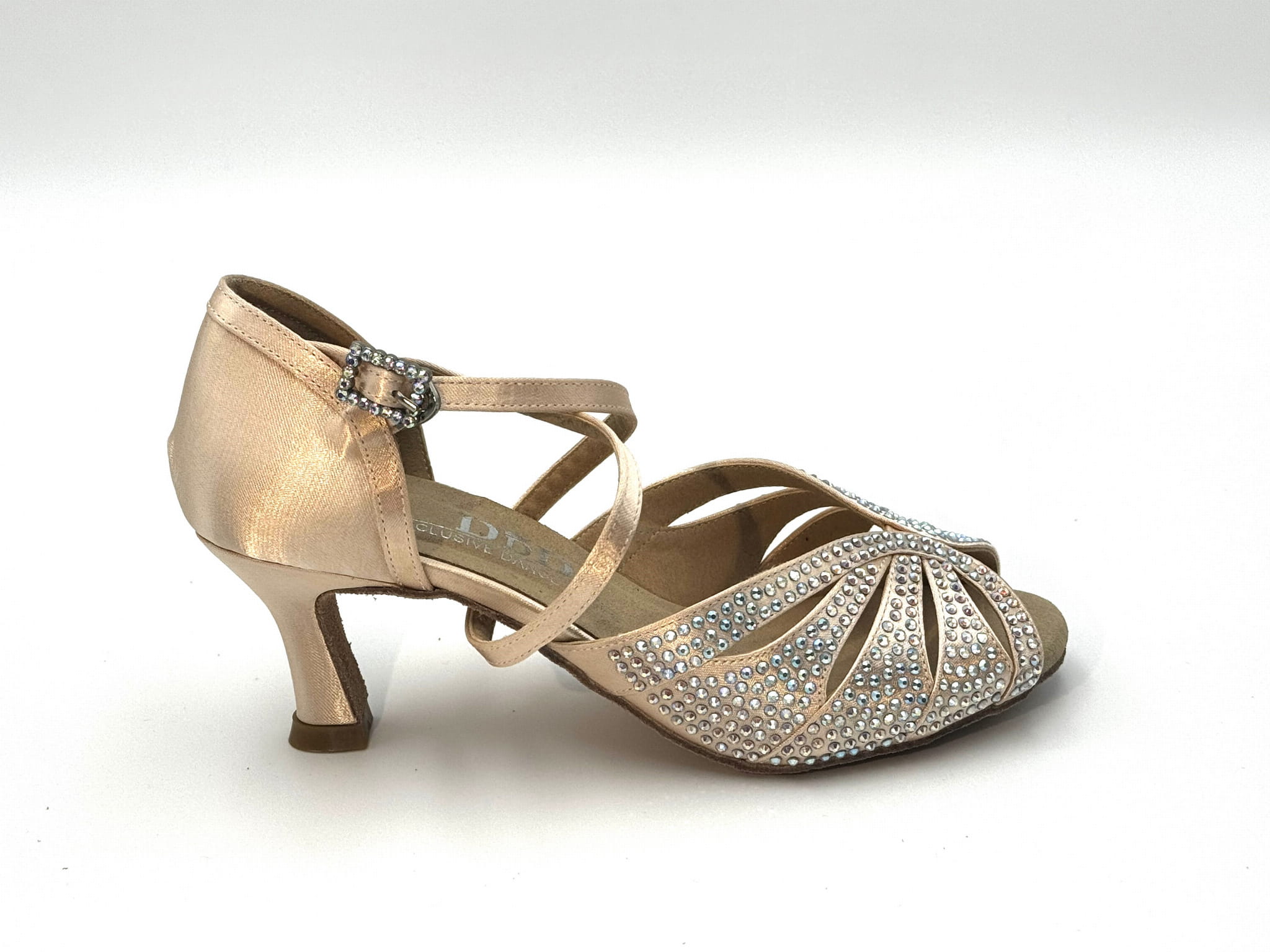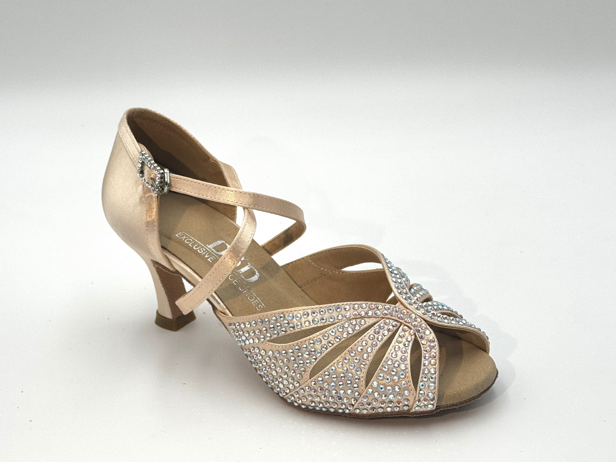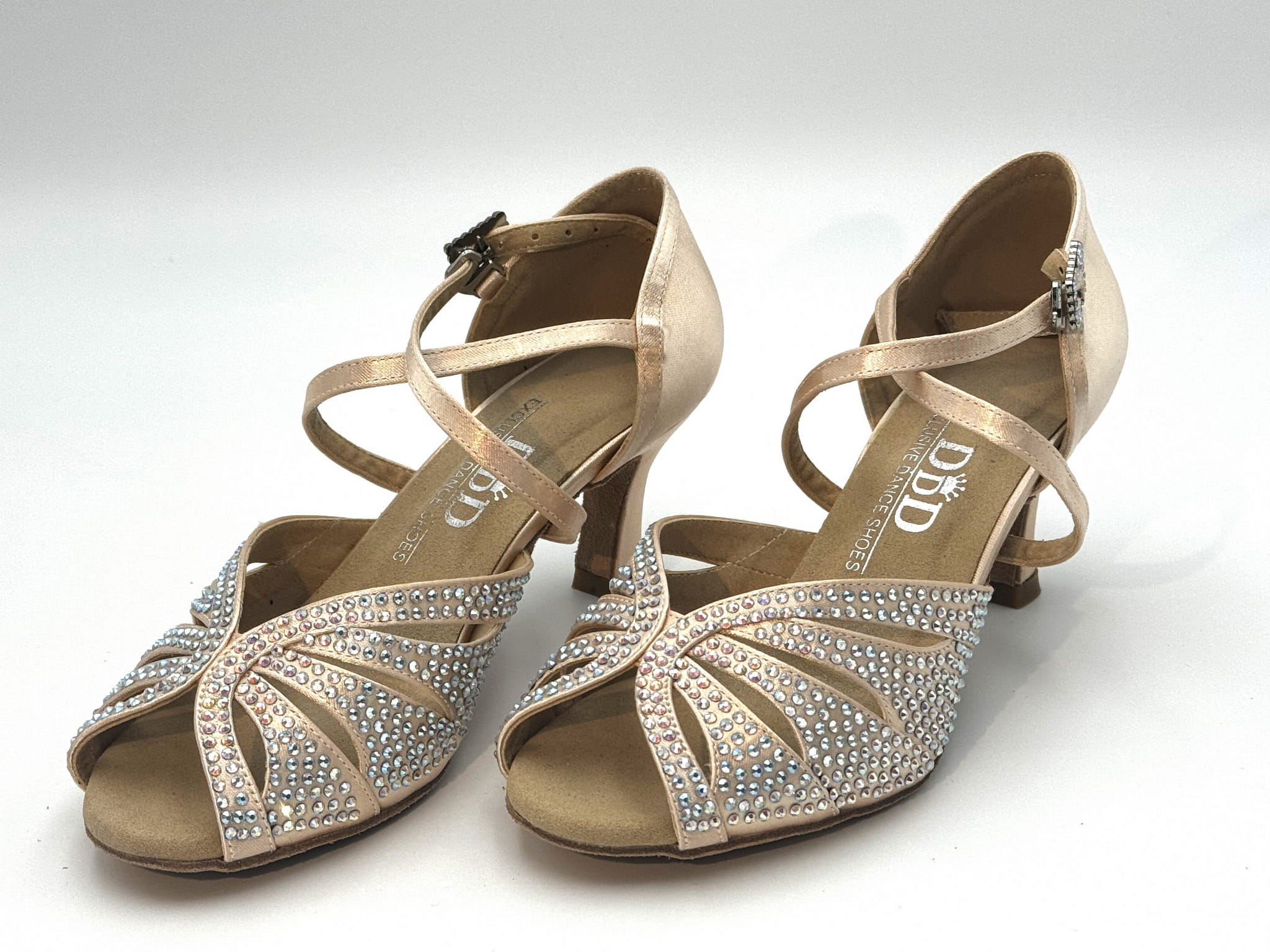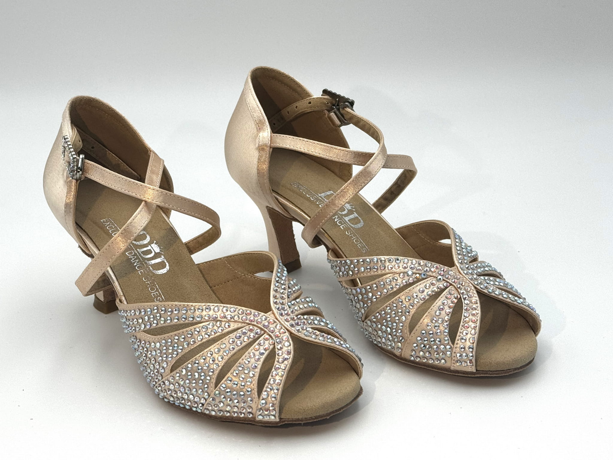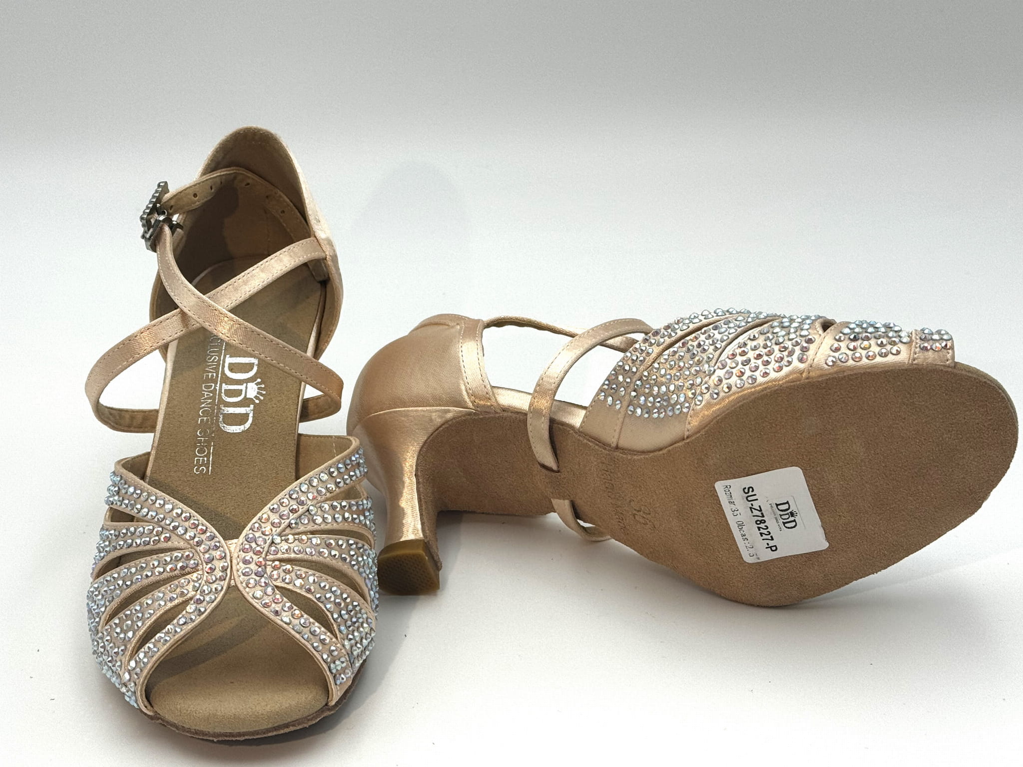 Wykonane z jest z satyny w kolorze odcieniu delikatnego różu i ręcznie zdobione kryształkami, szerokie paski zapewniają doskonałe trzymanie stopy i zabezpieczają przed wysuwaniem się stopy do przodu, przestrzeń między pasami obszyta cienką cielistą siateczką. Zapinane na elegancki, skrzyżowany pasek, oplatający podbicie i podeszwę lub kostkę, gwarantują pewność podczas każdego ruchu na parkiecie. Całość pokryta jest błyszczącymi kryształkami, które dodają butom wyjątkowego blasku i sprawiają, że wyróżniają się na każdej imprezie tanecznej. Dzięki swojej elegancji, buty te mogą być również doskonałym wyborem na specjalne okazje, takie jak śluby – stanowią idealną alternatywę dla klasycznych butów ślubnych.