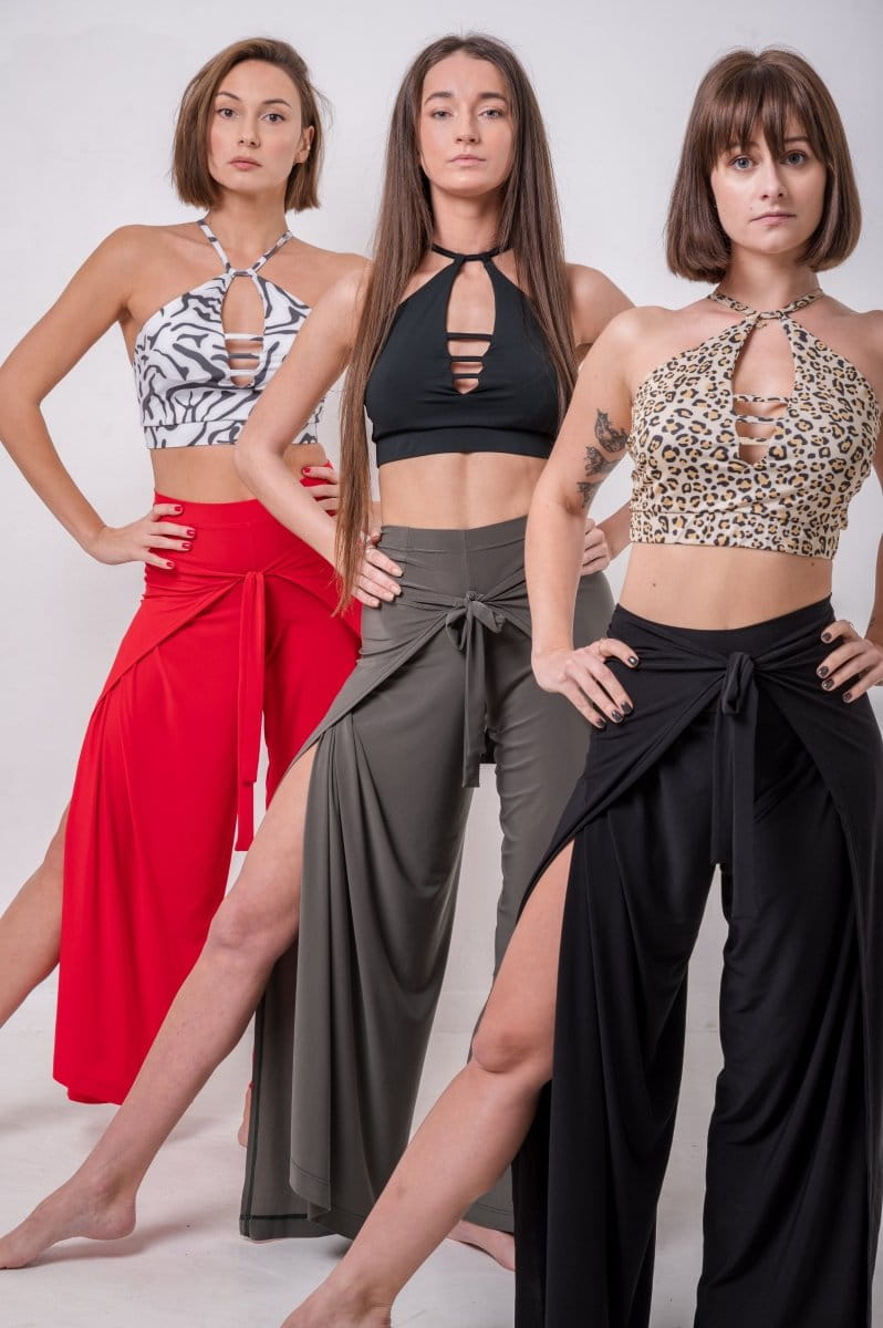 Spodnie są wykonane z lejącego, niemnącego się materiału, który doskonale podkreśla ruch ciała. Są idealne do każdego rodzaju tańca. Wyglądają perfekcyjnie także jako odzież casualowa. Świetnie grają ze szpilkami, ale i sneakersami.